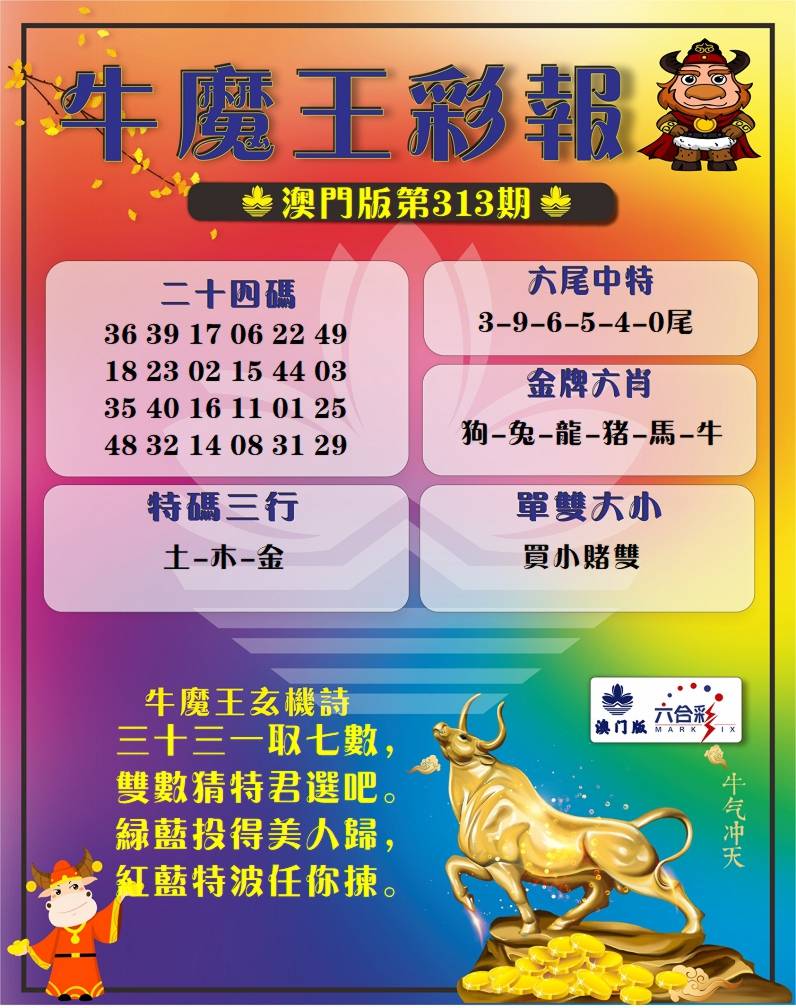| 311期 | 牛 | 3头 | 3尾 | 蛇37 |